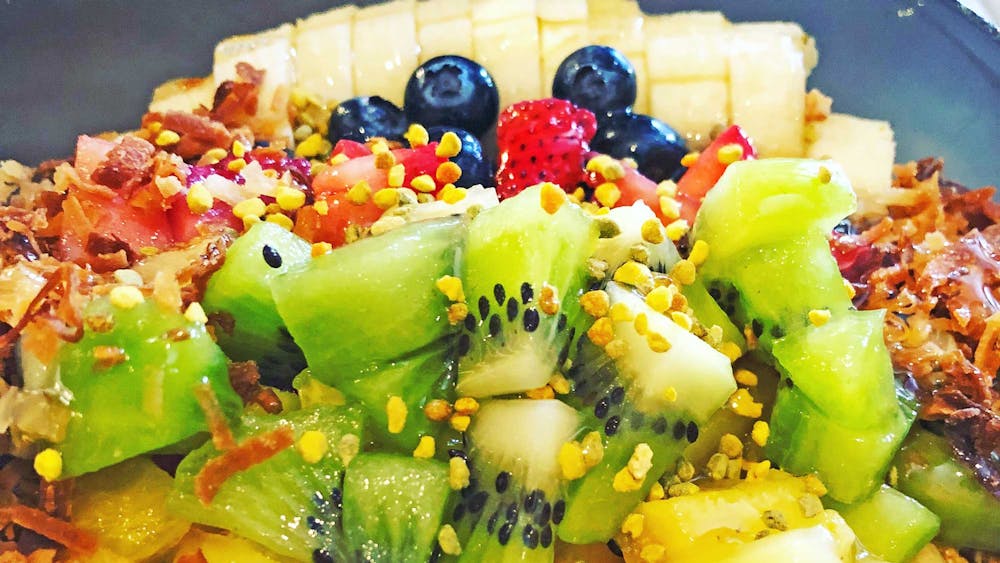 Acai topped with banana, strawberries, blueberries, apple, kiwi, pineapple, granola, toasted coconut, bee pollen, and honey