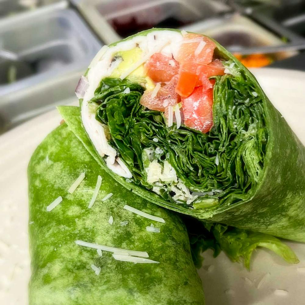 Oven-roasted turkey spinach, tomato, avocado, parmesan cheese, red onions, Caesar dressing
